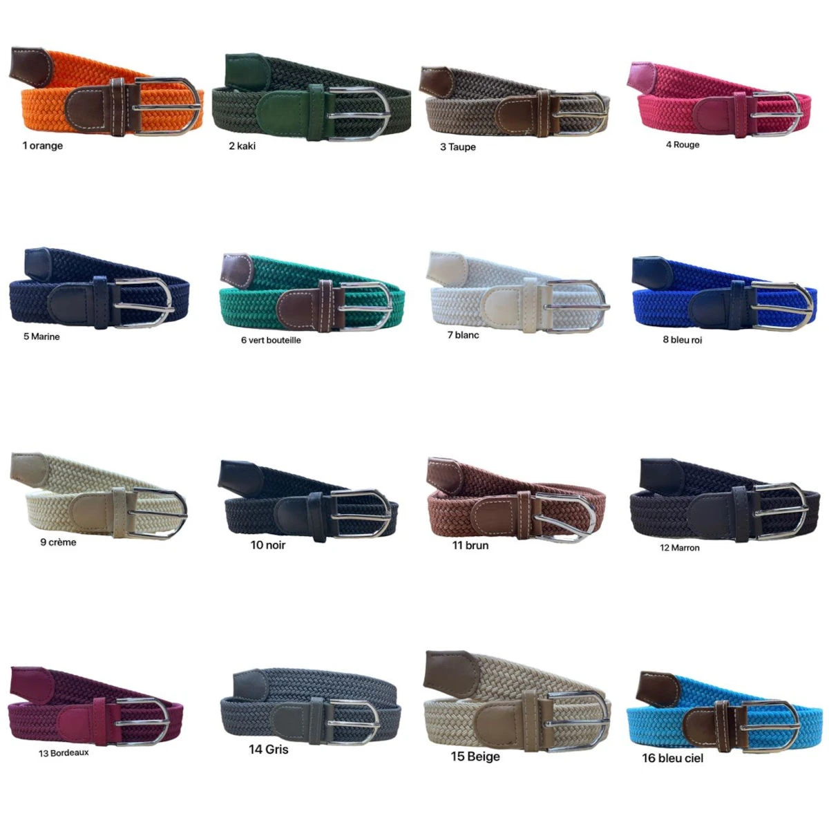 8-Bleu Roi, 9-Crème, 10-Noir, 11-Brun, 12-Marron, 13-Bordeaux, 14-Gris, 15-Beige, 16-Bleu Ciel .