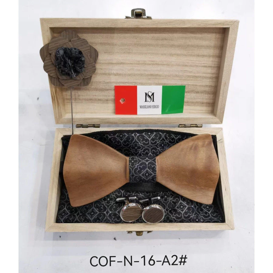 Un noeud papillon en bois avec au centre un ruban en tissu.