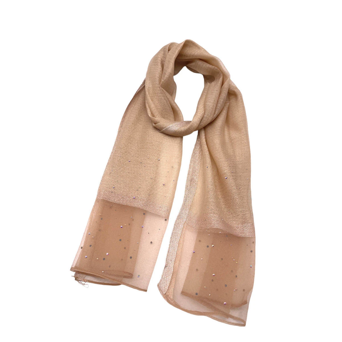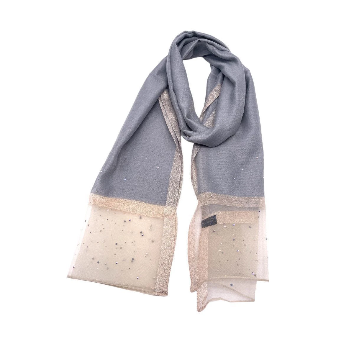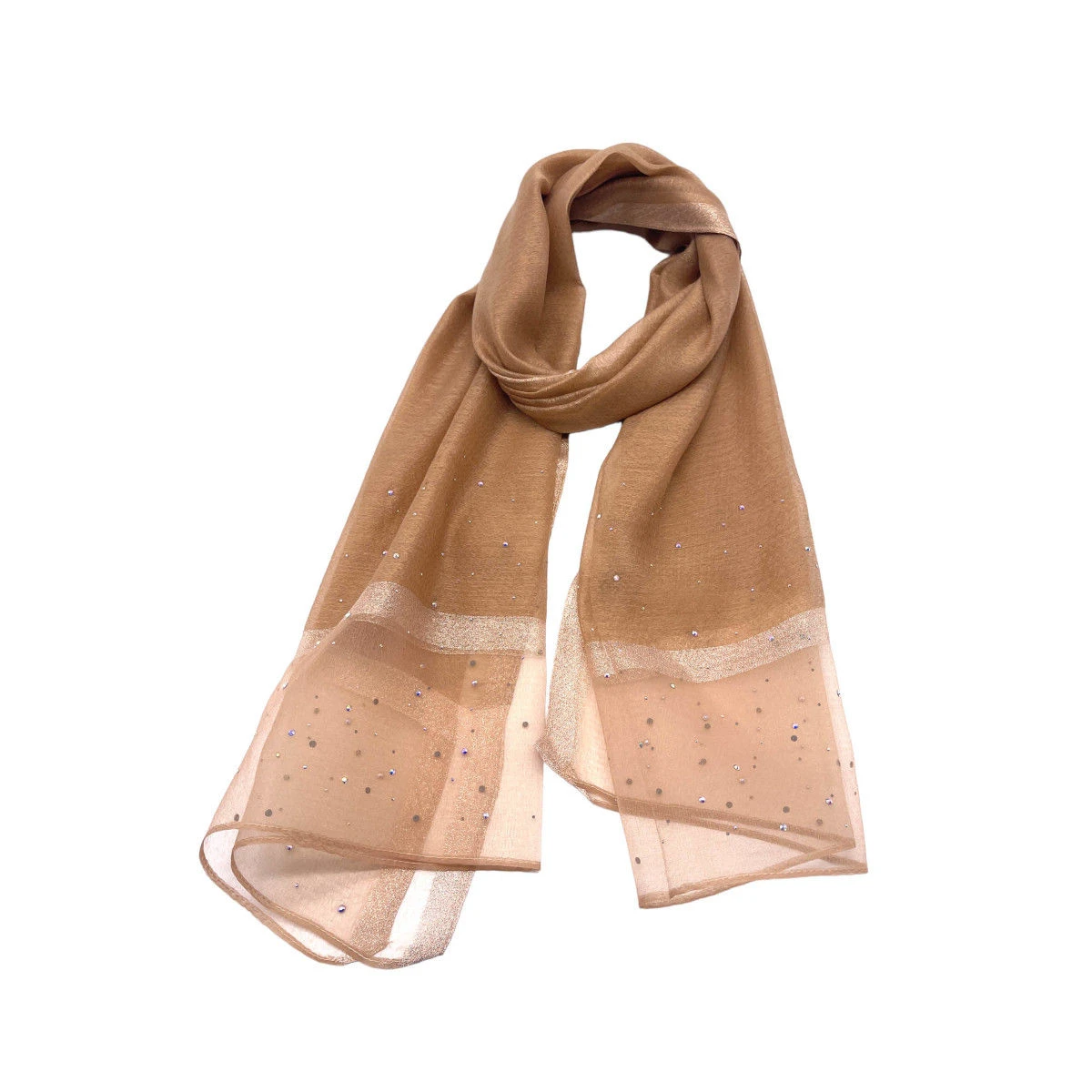 Écharpe enrichie de fils scintillants, décor à strass et d’une touche de soie.