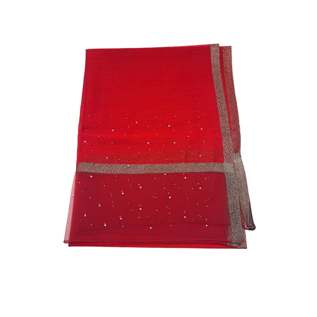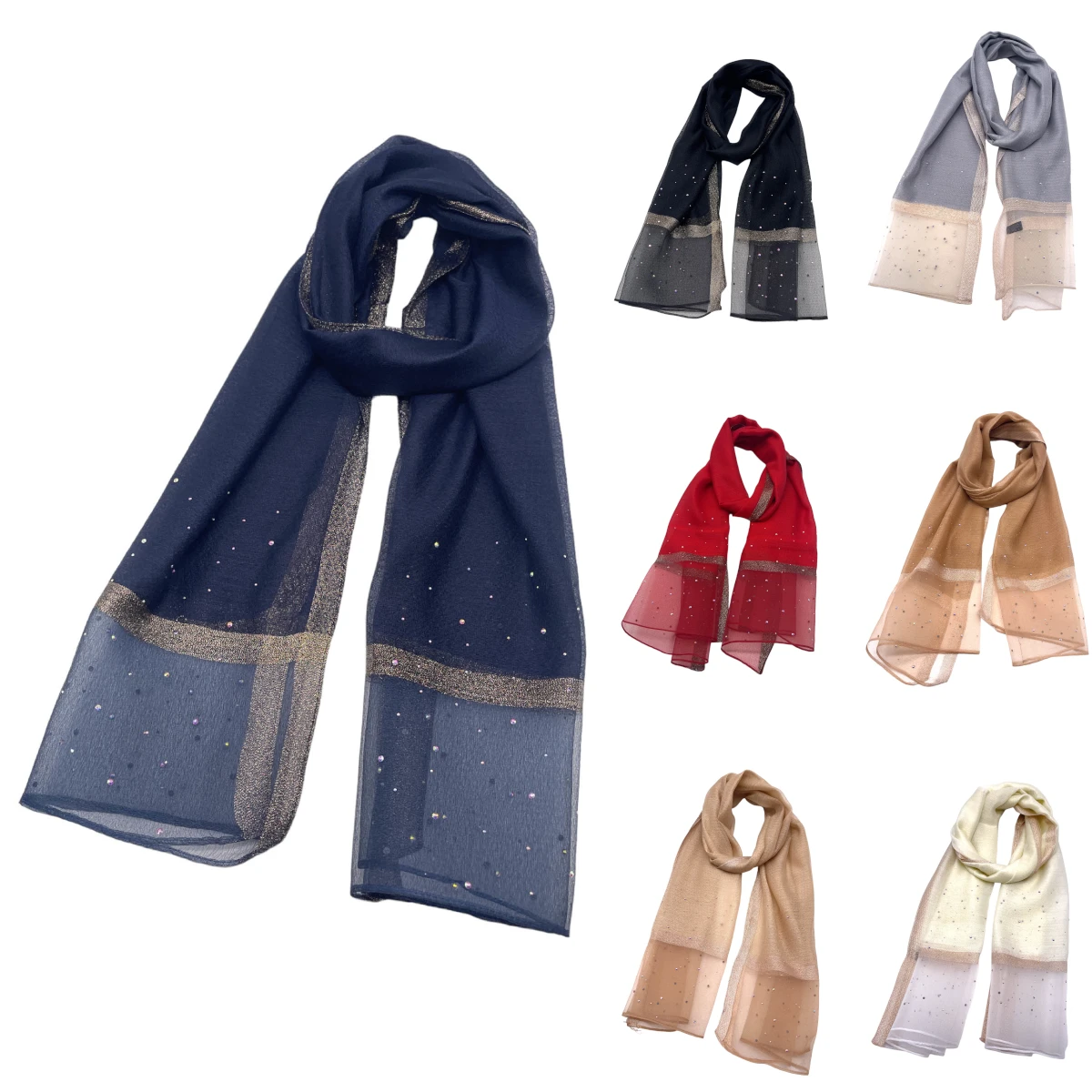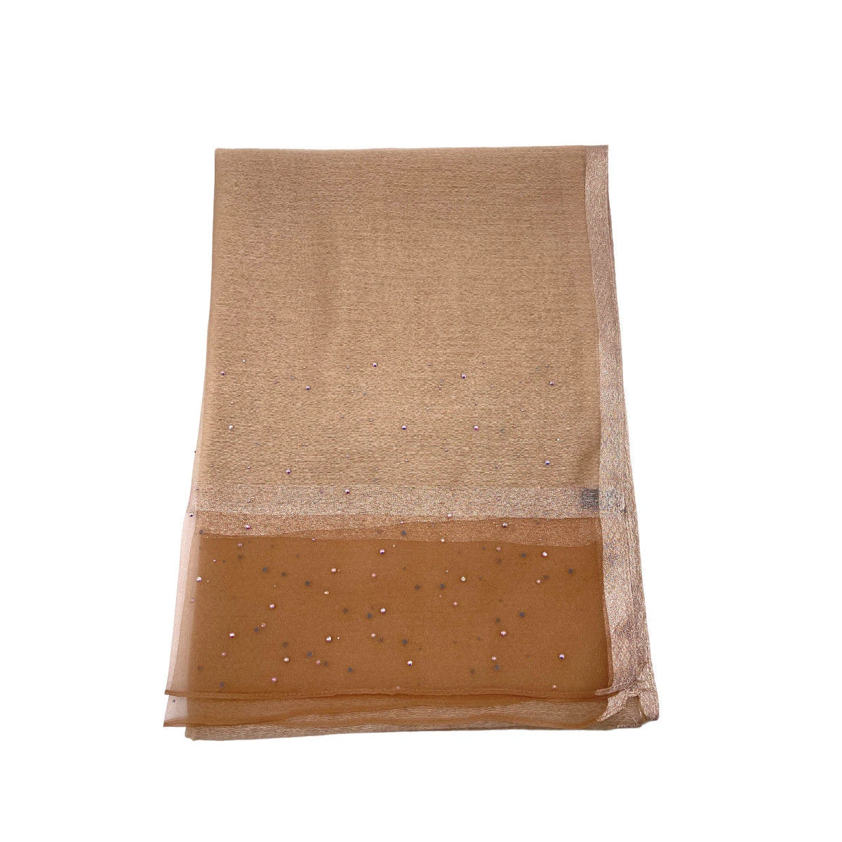Écharpe enrichie de fils scintillants, décor à strass et d’une touche de soie.