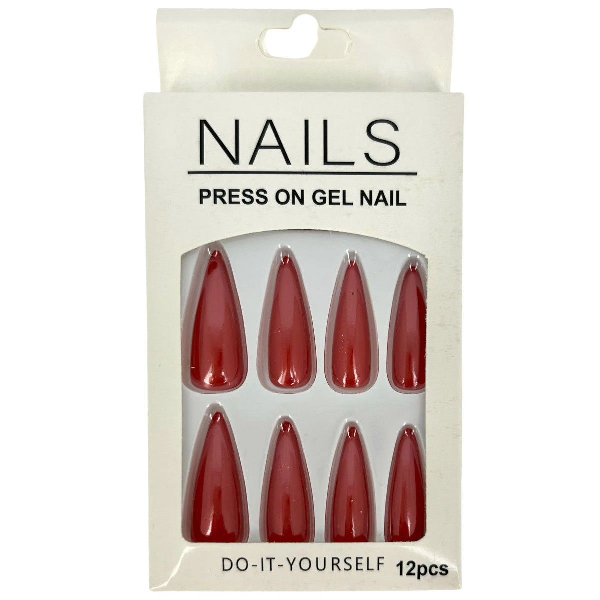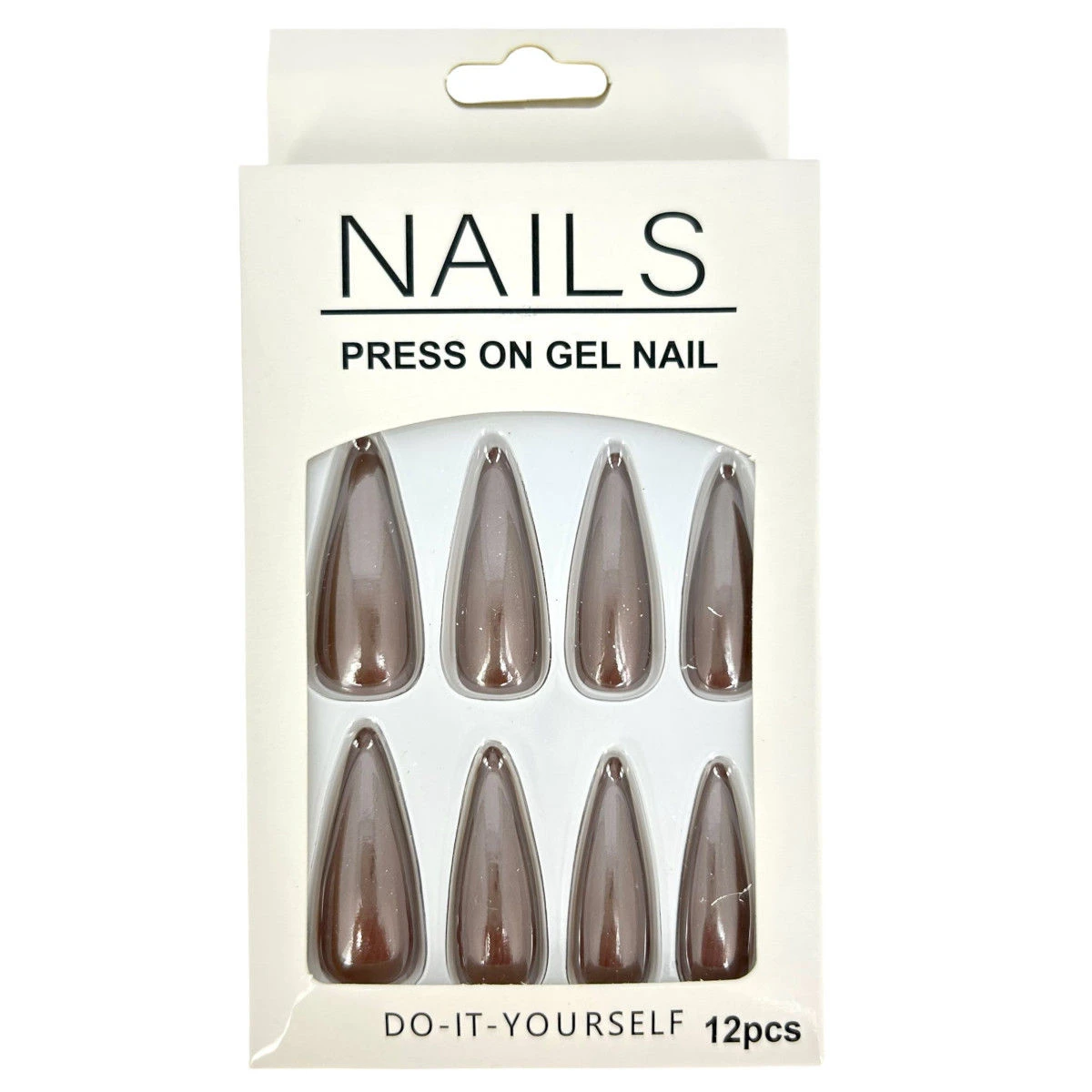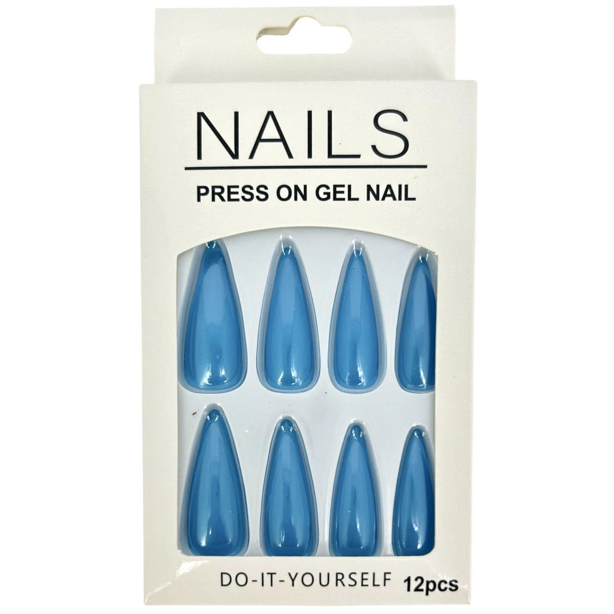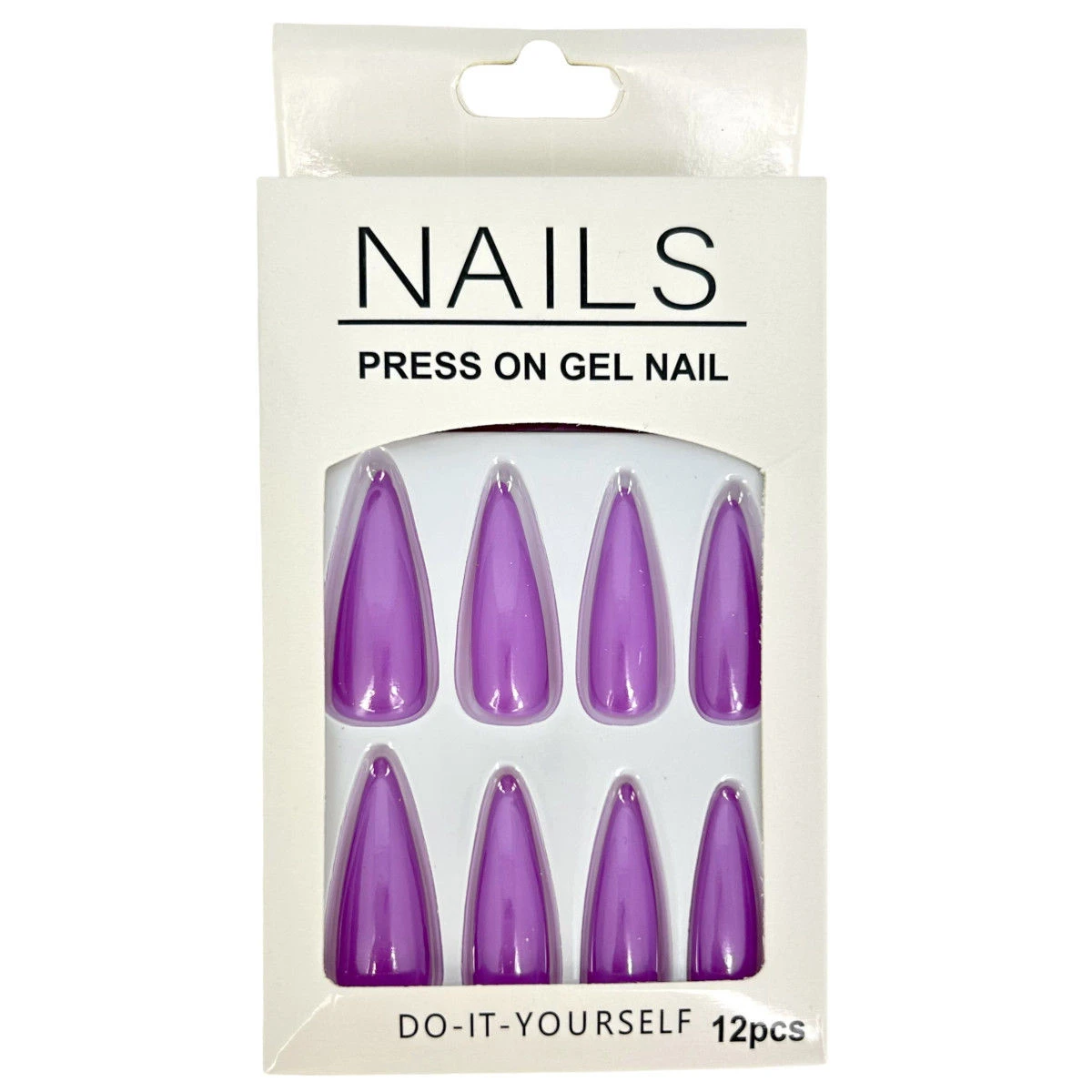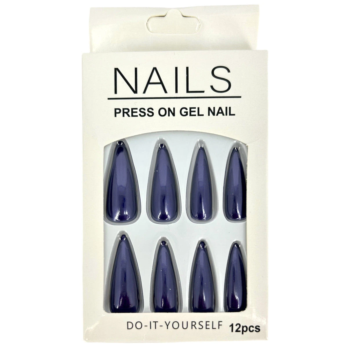 Pack de 12 faux ongles long en plastique de couleur unie effet métallisé.