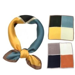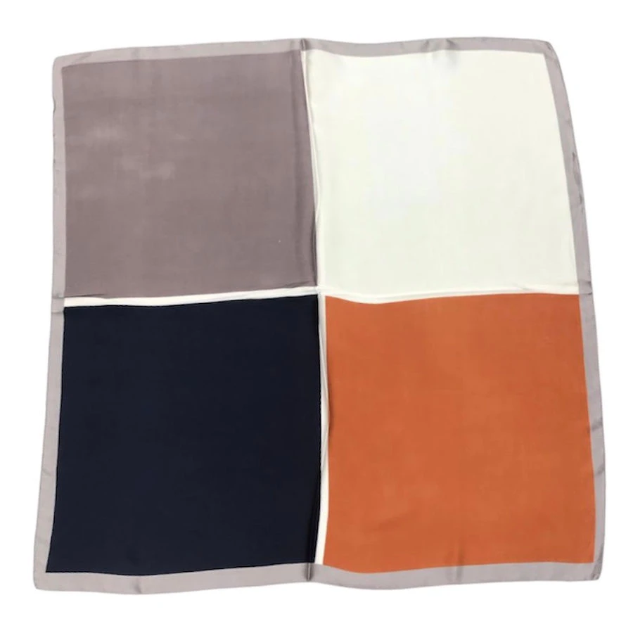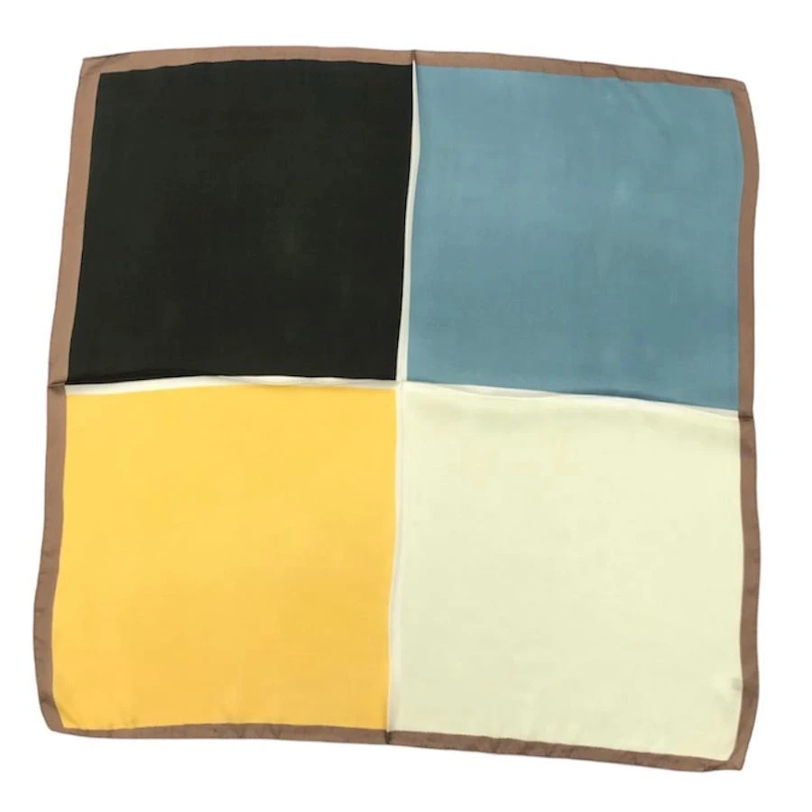 Foulard carré simple en polyester qui présente un imprimé color block en 4 couleurs.