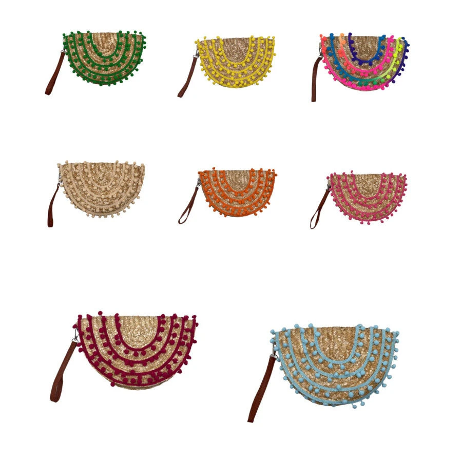 Une pochette à ouverture principale zippée joliment décorée de petits pompons.