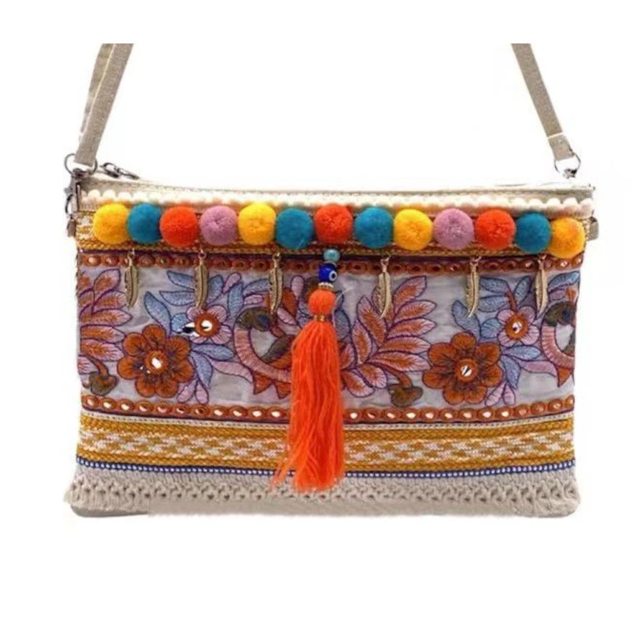 Sac pochette plate décorée en pompons multicolores et un pompon frange.