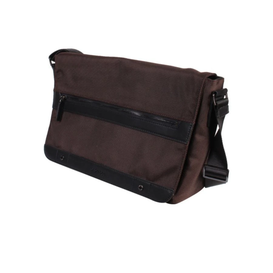 Sac bandoulière réglable fabriqué en polyuréthane et textile avec ouverture zippée sous rabat.