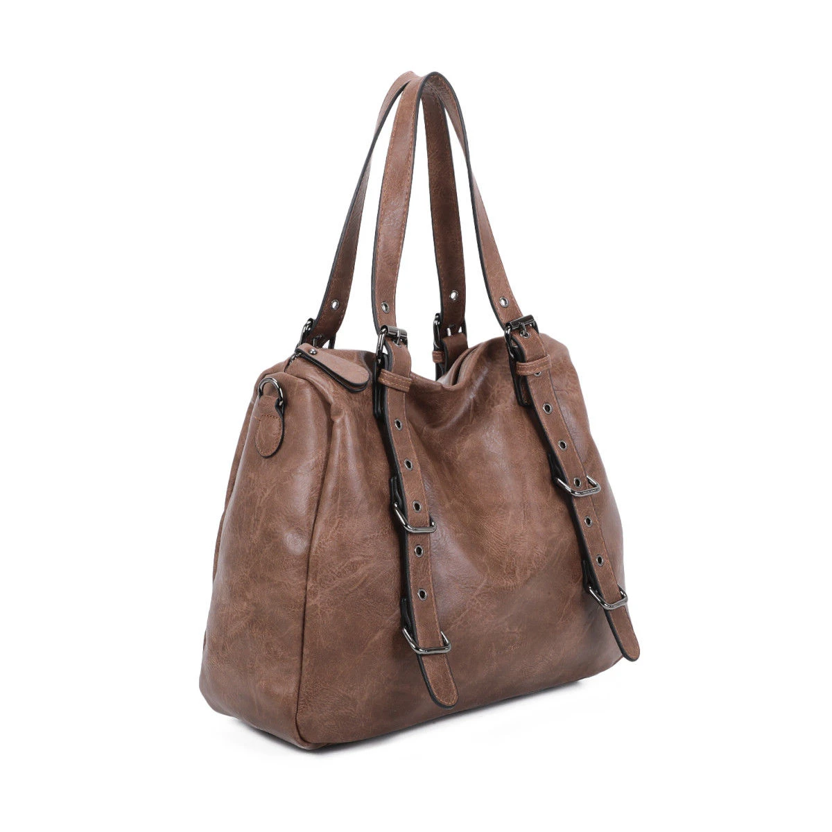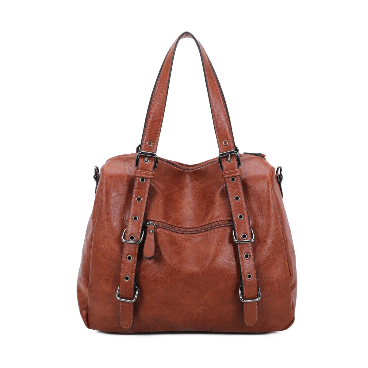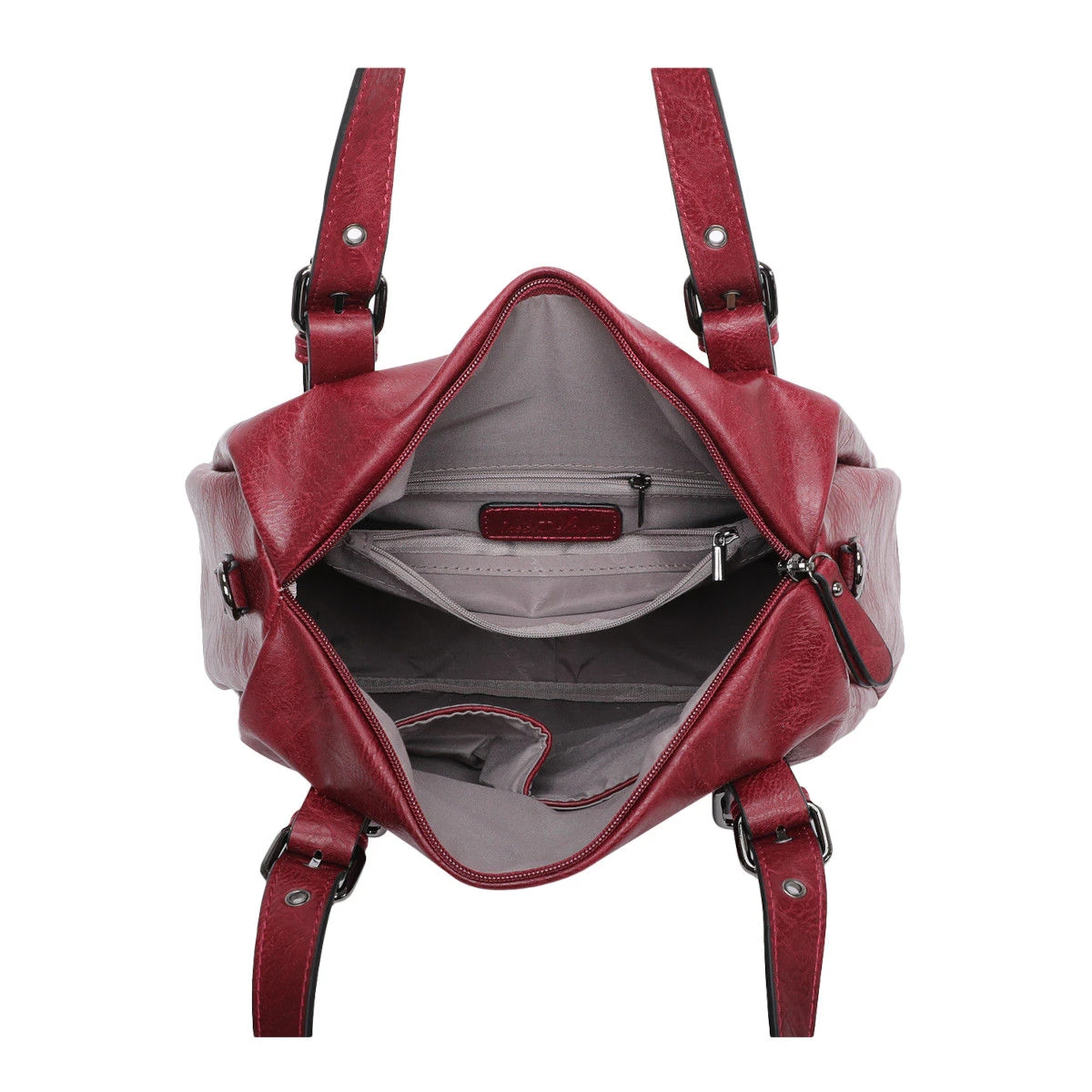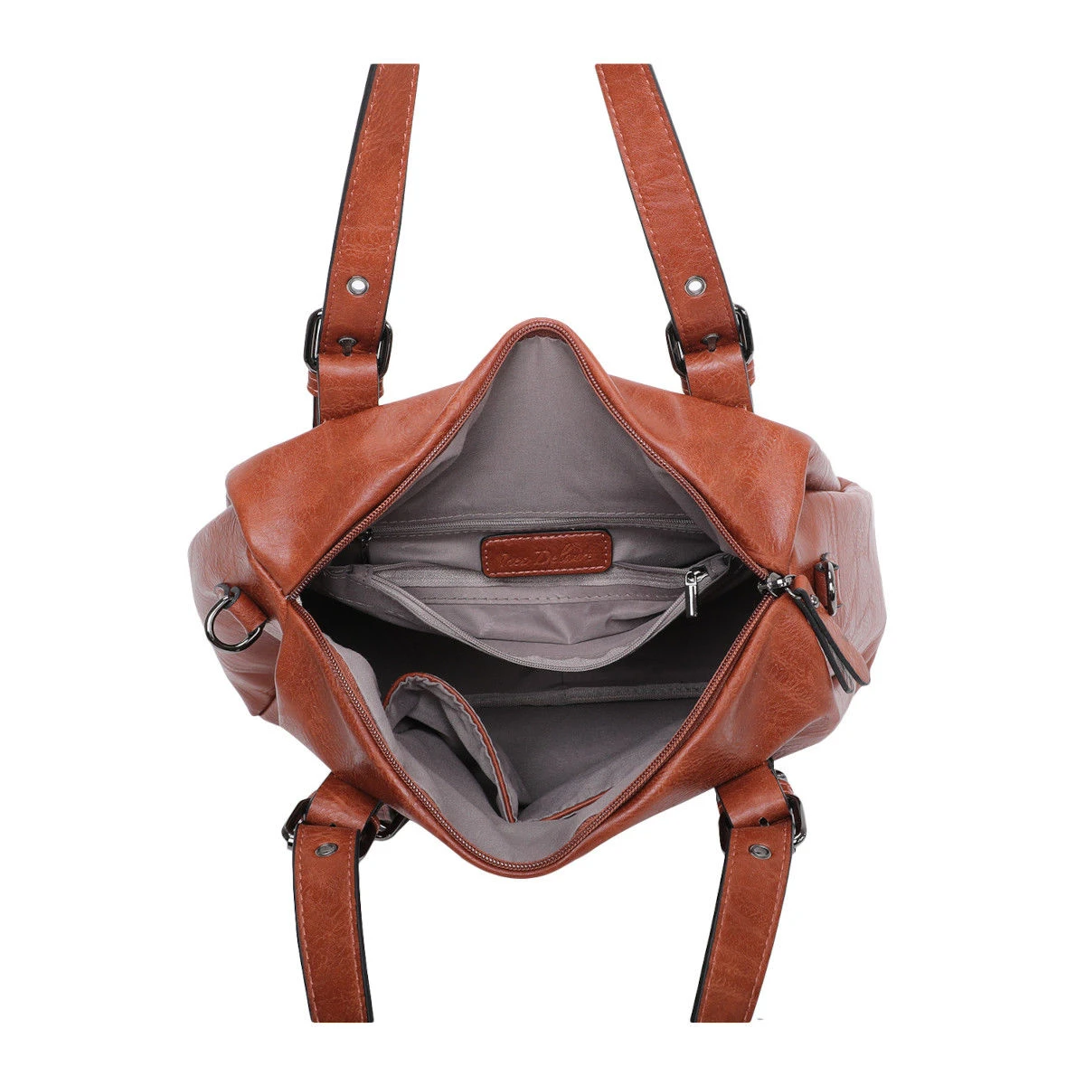 Sac à main en simili cuir souple avec un grand compartiment à fermeture à glissière sur le dessus.