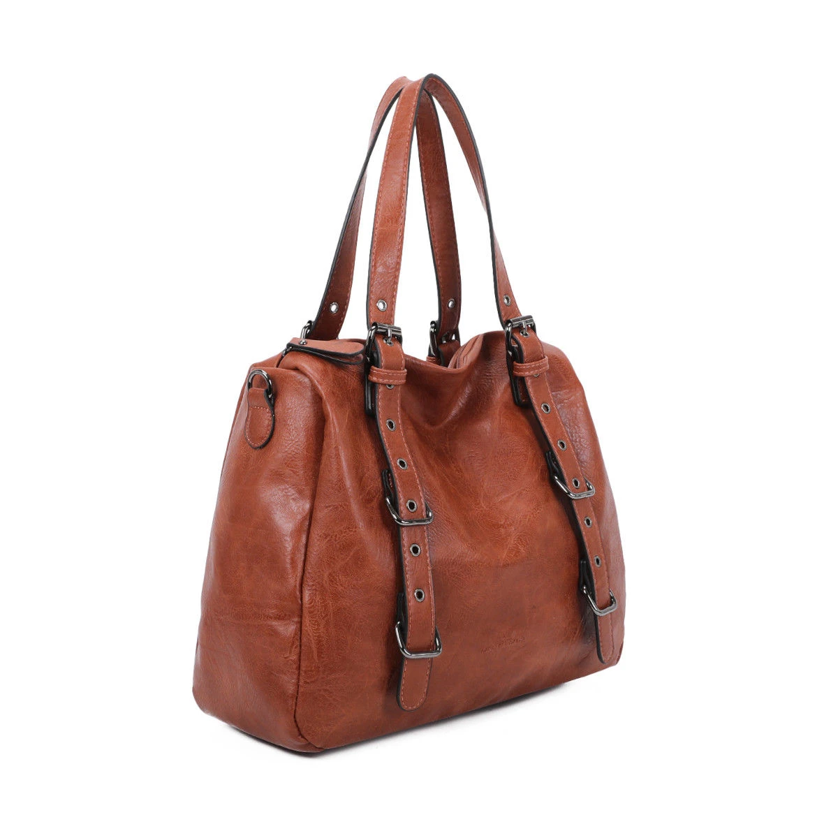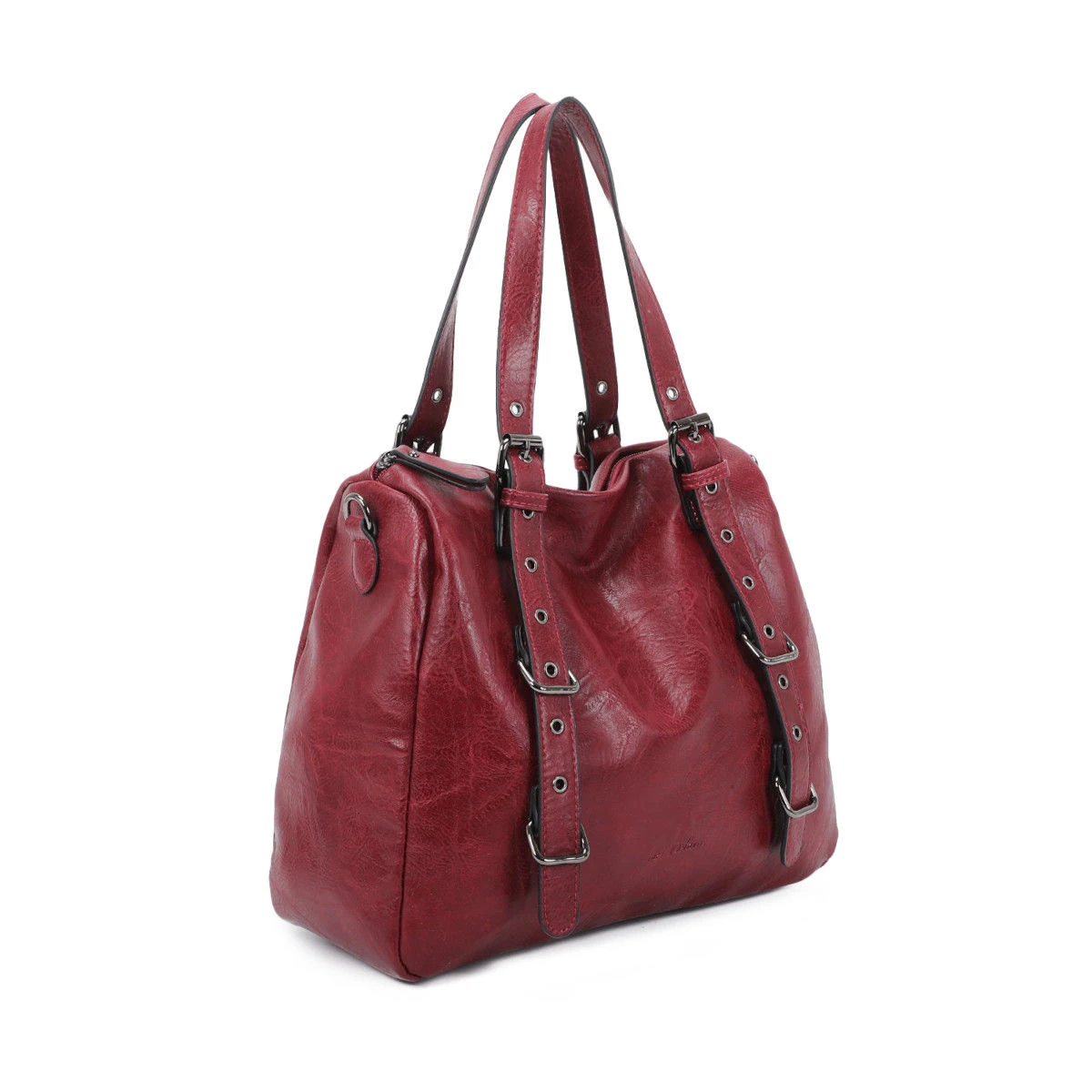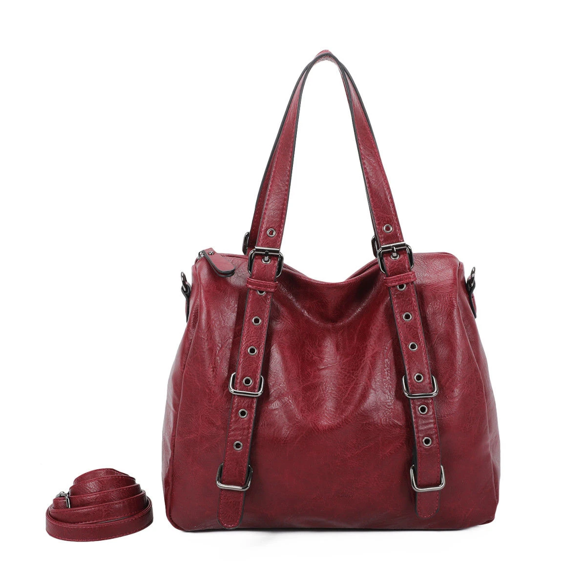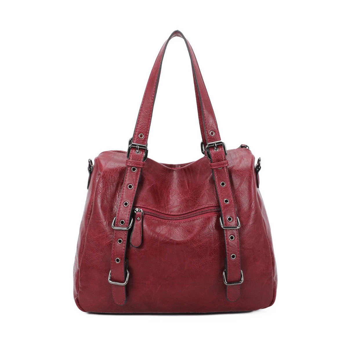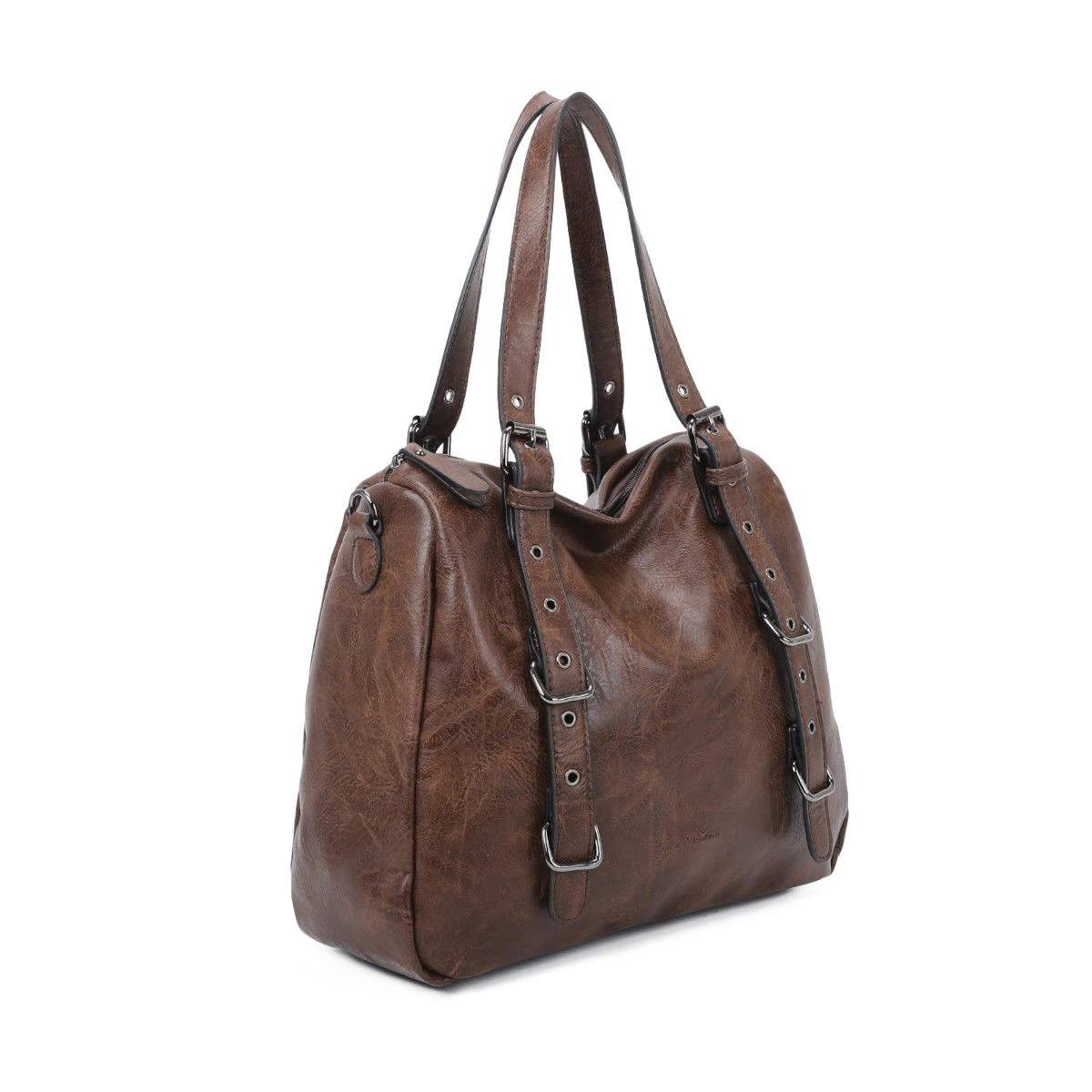 Sac à main en simili cuir souple avec un grand compartiment à fermeture à glissière sur le dessus.